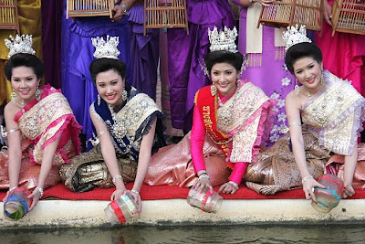 Songkran is also celebrated in many places with a pageant in which young women demonstrate their beauty and unique talents, as judged by the audience. The level of financial support usually determines the winner, since, to show your support you must purchase necklaces which you place on your chosen girl. (Yes, you read that right - a beauty pageant is a part of the celebration! Just another way for me to feel connected to Thai culture! ;)